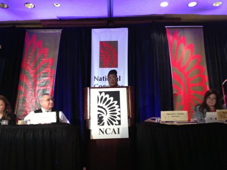 Gwen speaks at a National Congress of American Indians event to praise the Violence Against Women Act passage.